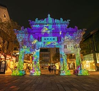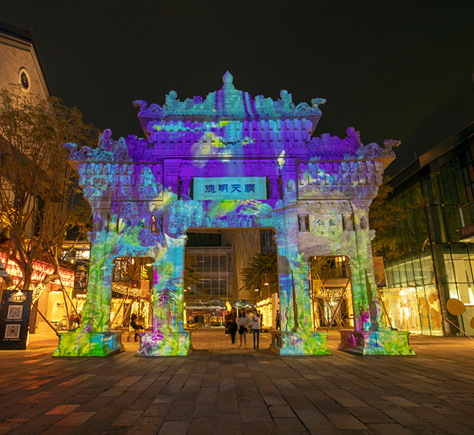 光影秀以状元牌坊为“主角”,将现场环境、建筑物、建筑墙面等组合成一个空间,配合 投影、激光、烟雾、舞台灯、投影等多项技术。